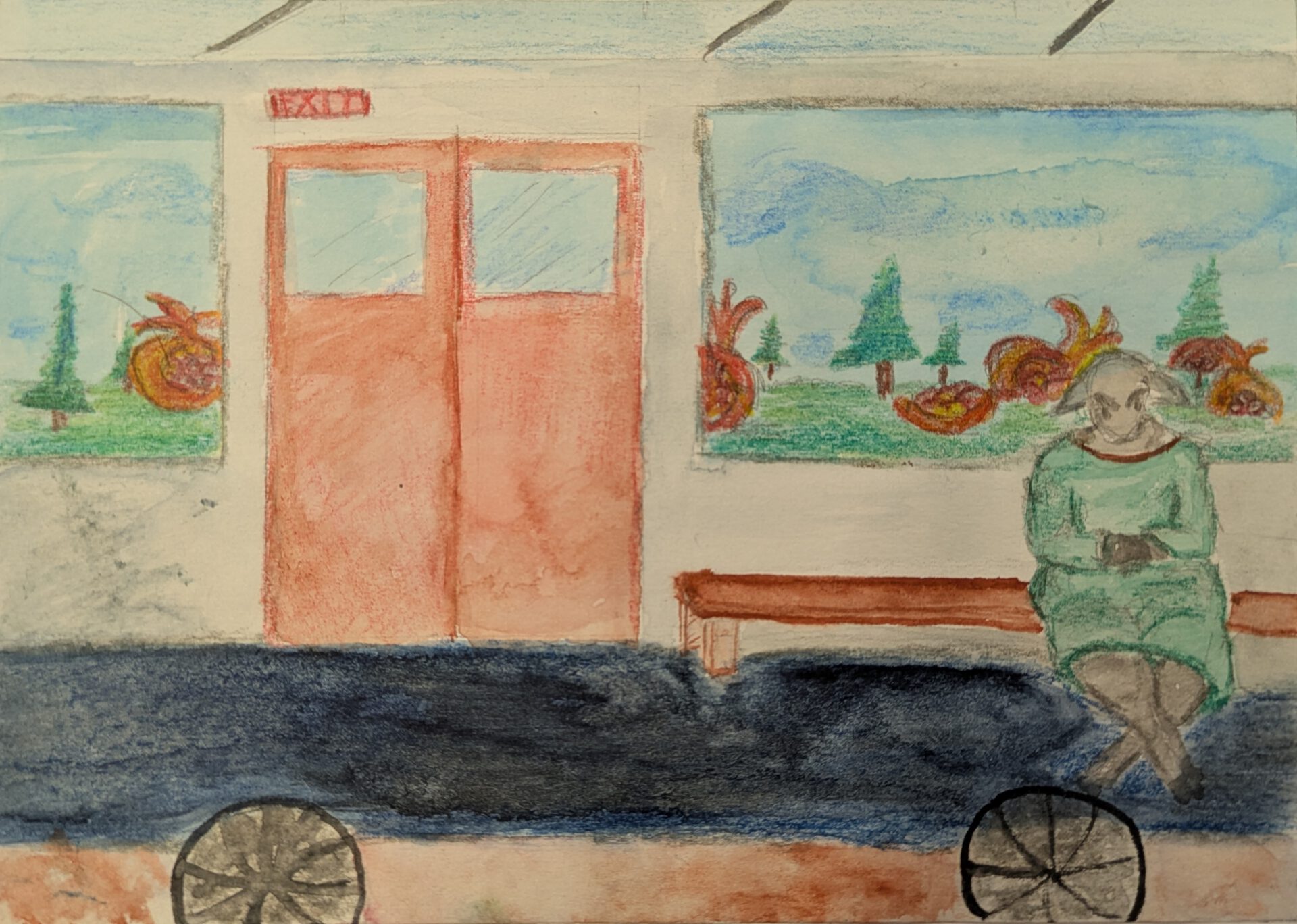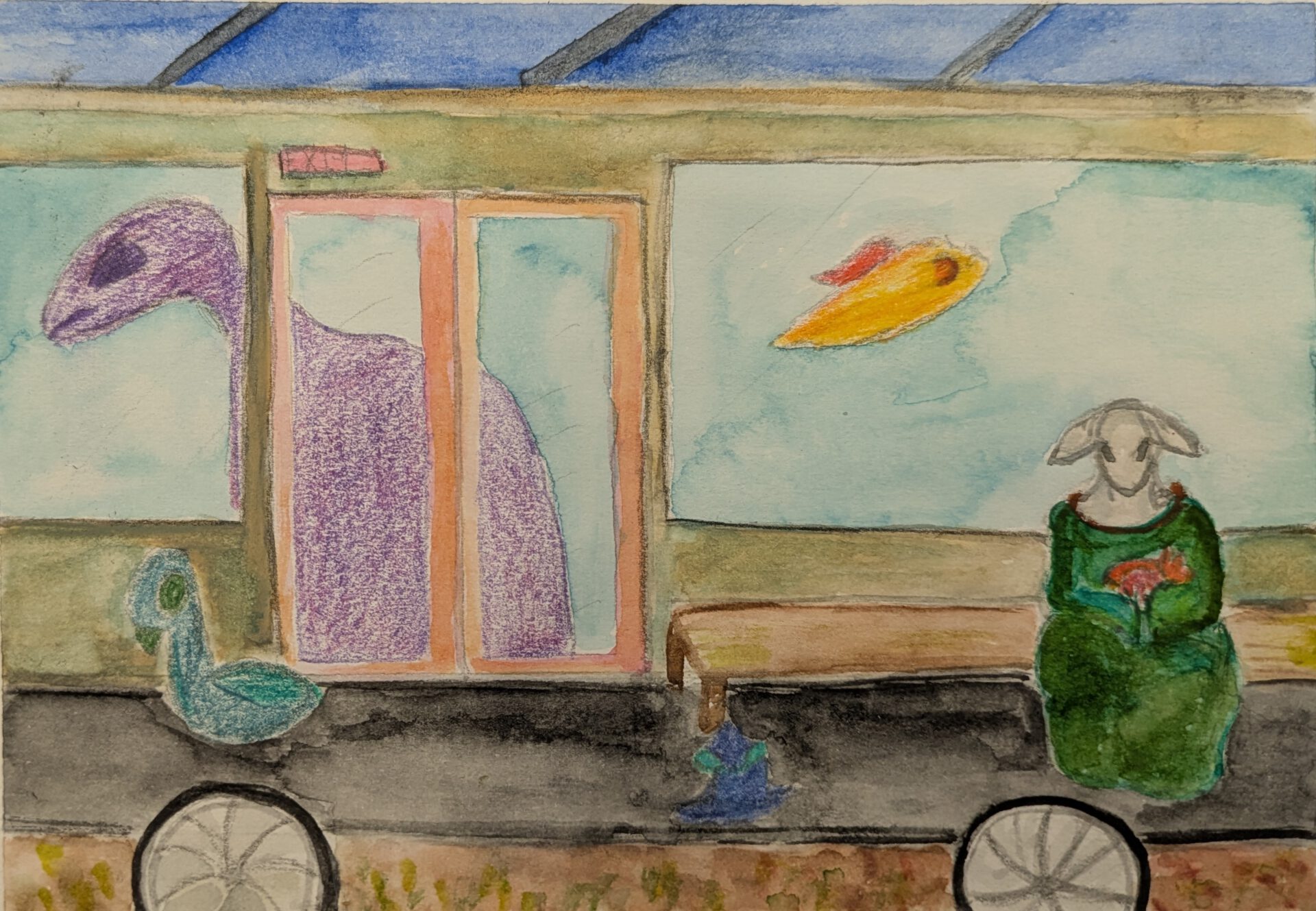 Watercolour and coloured pencil.
