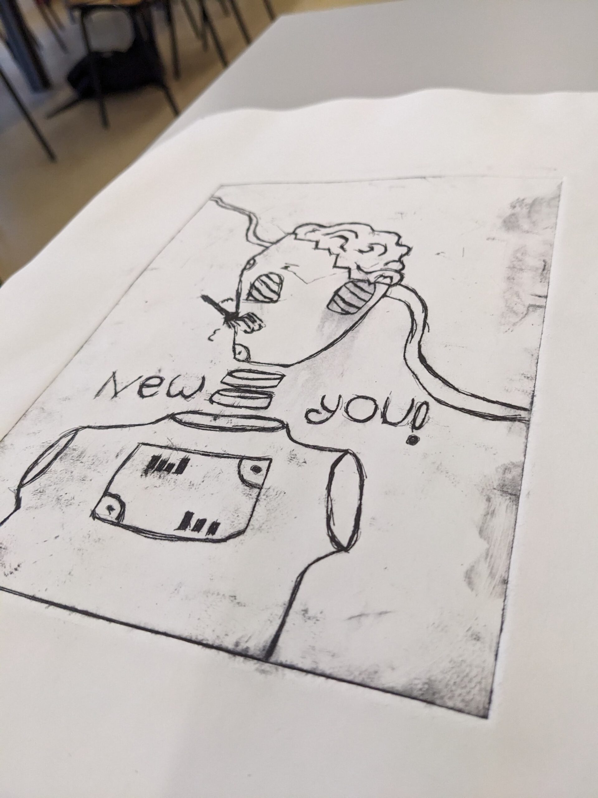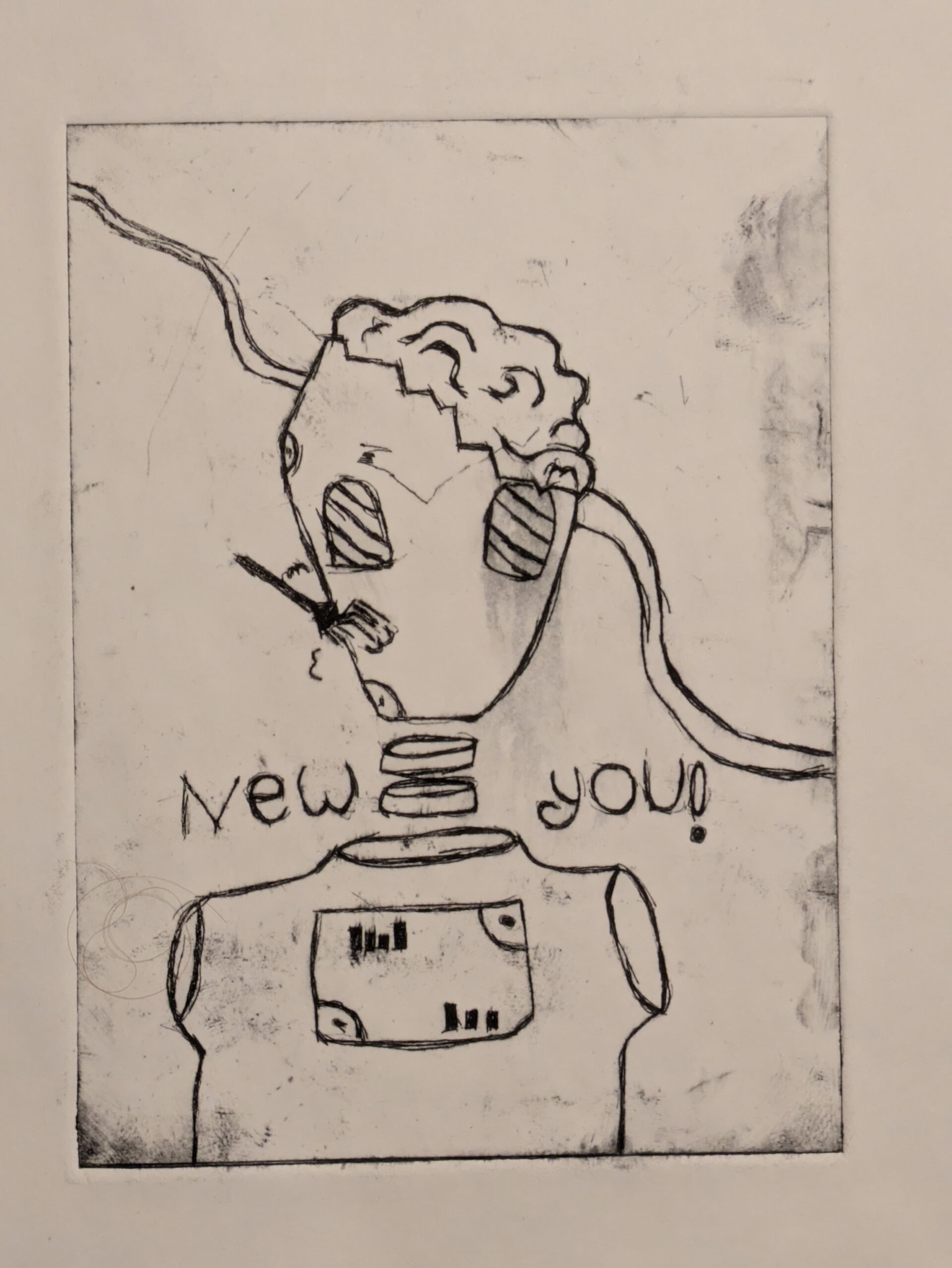 This work was created during my internship at the Wirtschaftsakademie Nord. For my first attempt at gravure printing, I chose a motif inspired by the movie quote “Why be you when you can be new?” from the film Robots. The piece reflects today’s distorted ideals of beauty and the pressure to constantly reinvent oneself.